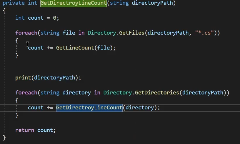해당 형태로하면 첫번째 향상된for문에서는 *.cs를 찾으면 라인수를 세서 더해줄 것입니다.