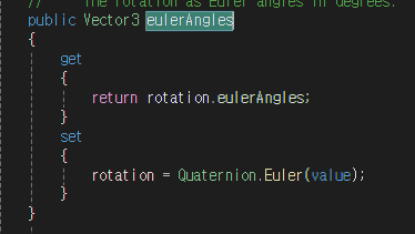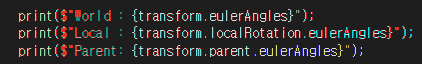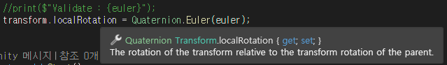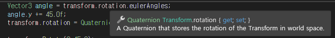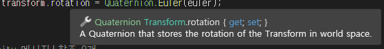 중요한건 transform.rotation의 정보가 Quaternion이라는 점입니다.