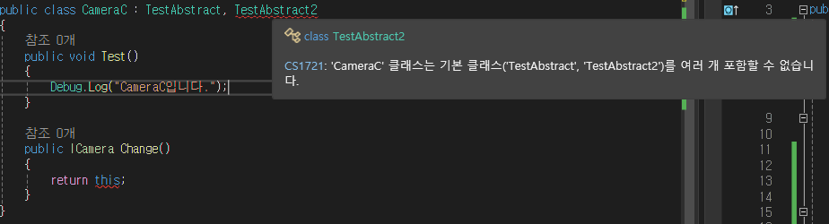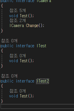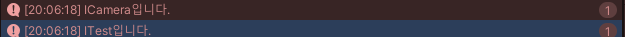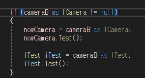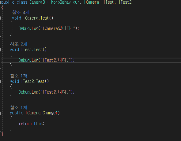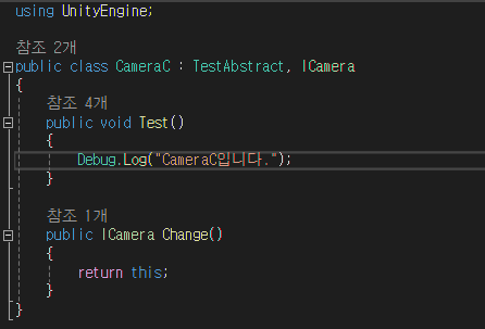 MainCamera에서 CameraA , CameraB, CameraC를 초기화하고 , 실행시켜보면 ICamera를 상속 받았기 때문에 Test()가 실행됩니다.