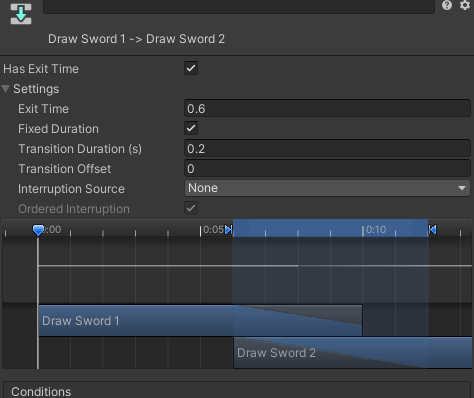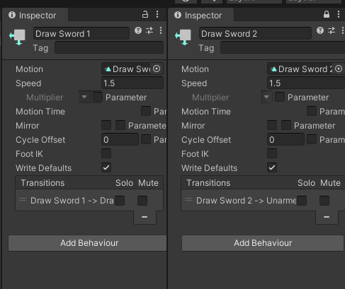Draw Sword 1 > Draw Sword2로 넘어갈 때에 애니메이션에 Speed를 1.5로 넣었을 때에 문제가 발생합니다.