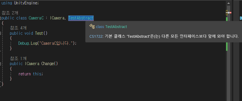 만일 Abstract와 Interface를 동시에 쓰려면, 순서에 따라 에러가 뜹니다.