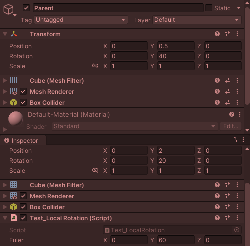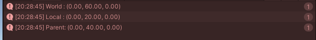 그러므로 로컬에는 0,20,0이 나오고 world로 보면 0,40+20 = 60,0이 찍히게 됩니다.