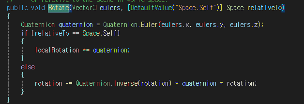Rotate에도 Quaternion.Euler를 통해 또 다시 값을 치환해줍니다.