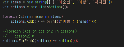 Action을 List에 넣어서 활용하는 모습입니다. 이런 식으로하면 유니티에서 이벤트 발생한거 처리를 편하게 쓸수 있을 듯합니다.