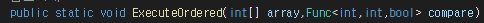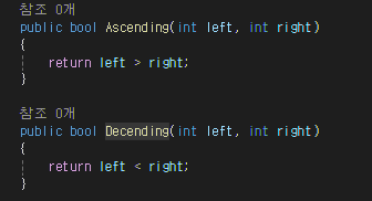 Func가 가능한 이유는 public bool Ascending(int,int right,return) 이렇게 Func와 형태가 같기 때문입니다.