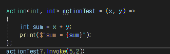 actionTest?.Invoke는 actionTest가 null이 아닐 경우에 실행하라는 의미입니다.